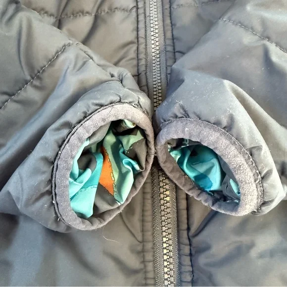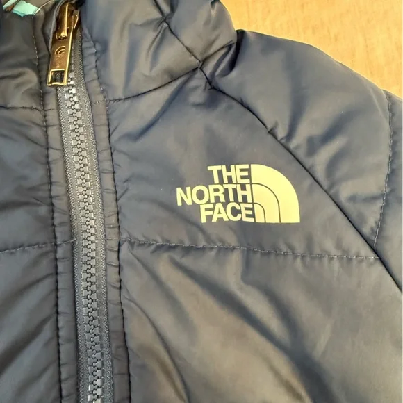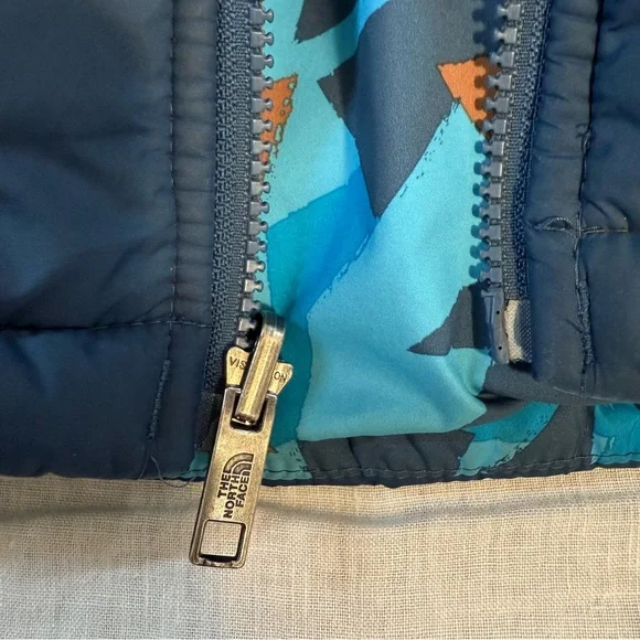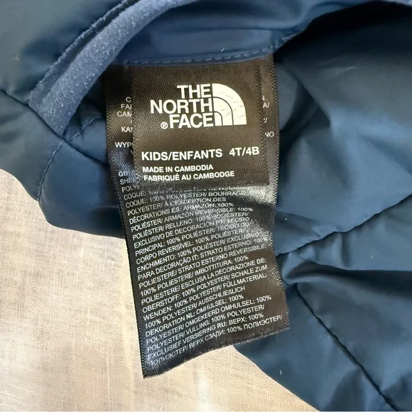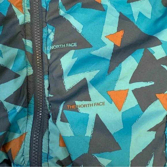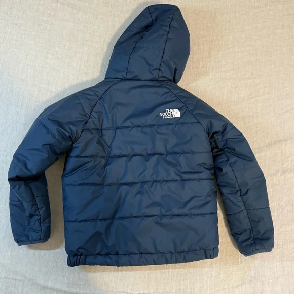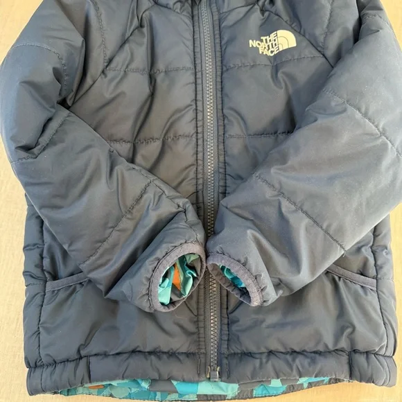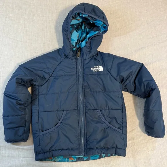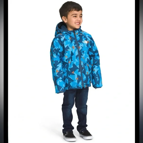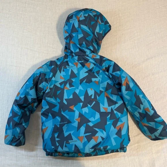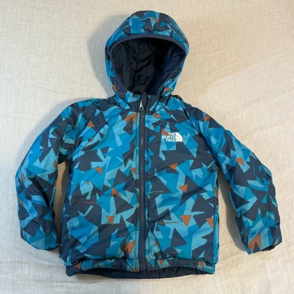 In preowned condition with light signs of wear. Color: Shady Blue or Acoustic Blue Triangle Camo (listing both for exposure, not sure what the official color name is.) Not just reversible, but water-repellent on both sides, the Kids’ Reversible Perrito Hooded Jacket will open the door to new winter adventures. This toasty winter coat is lined with lightweight, reliable Heatseeker™ Eco insulation.The North Face Reversible Perrito Hooded Jacket Toddlers' Features & Specifications:•Fully reversible•Outer and reverse made with recycled polyester•Heatseeker™ Eco insulation for warmth even in wet weather•Attached, three-piece hood•Exposed, VISLON® center front zip with a chin zip guard•Split kangaroo hand pocket on outer•Elastic binding on hood, pockets, cuffs and hem•Heat transfer logo on left chest and back-right shoulder of outer and left chest of reverse•outer: 50D 76 g/m² 100% recycled polyester with non-PFC durable water-repellent (non-PFC DWR) finishreverse: 50D 73 g/m² 100% recycled polyester with non-PFC DWR finish•insulation: 200 g Heatseeker™ Eco 70% post-consumer recycled polyester in body, 150 g in sleeves and 100 g in hoodBin: 20