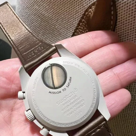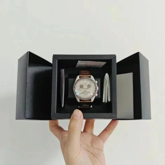 Brand new, unworn, no wear, no defects, perfectSand, cool beige and brown dials contrast with the VELCRO© strap. The chronograph second hand, small dial hands and speed scale background are shown in brown. The small dial of the second hand is painted with Saturn's ringsAll dials are decorated with the OMEGA X SWATCH brand logo, the classic Speedmaster logo and the new MoonSwatch logoAll models are made of clear glass, and Bioceramic materials provide a chic and delicate touch.Dial diameter: 42.00mm. Strap material: Velcro. Case material: Innovative botanical ceramics