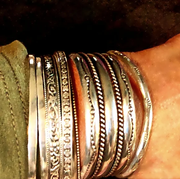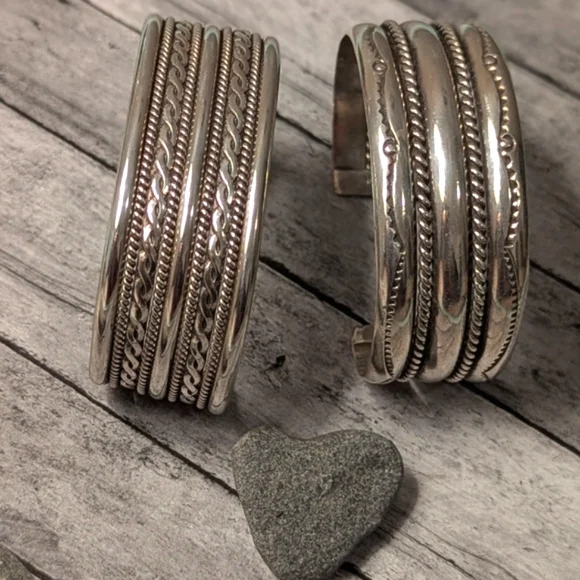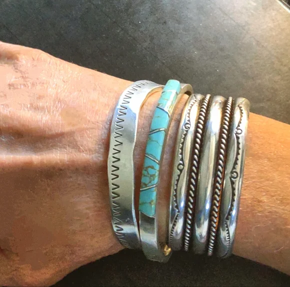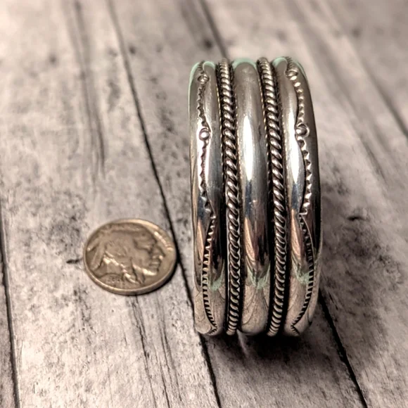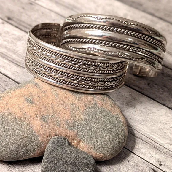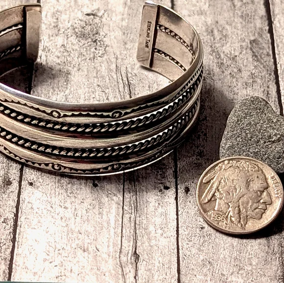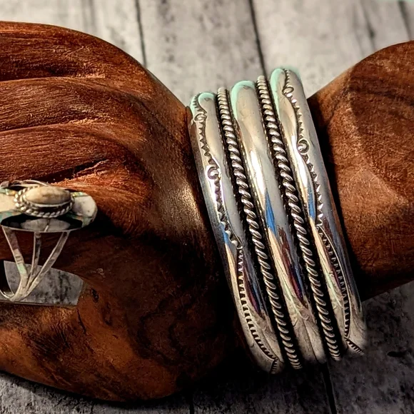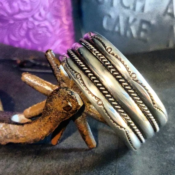 Vintage Navajo Elaine Tahe Sterling Silver Cuff is bold and fabulous. Three bands of sterling with traditional hand stamped design and twisted rope in between.A collectors piece that is in very nice pre~loved vintage condition. The solid Sterling Silver is substantial but easy to wear. There isn't a lot of flex to it so it can't be modified much.Will look fabulous alone or stacked with other cuffs. Very eye-catching worn either way.This is a wonderful piece to add to your collection, and a great investment to pass on. Authentic signed Sterling jewelry like this will increase in value as it ages. This is circa 1980's.Stamped "Sterling".Signed/Hallmarked "Tahe" by Navajo Silversmith Artist Elaine Tahe.Length is 5.25" measured inside end to end. Gap is 1.25"Total circumference is 6.50". Weight is 42 grams. Will come wrapped in a gift box and includes a reusable polishing cloth. ***I have the other wide Tahe cuff in the photos for sale in another listing. The other bracelets will be listed soon.